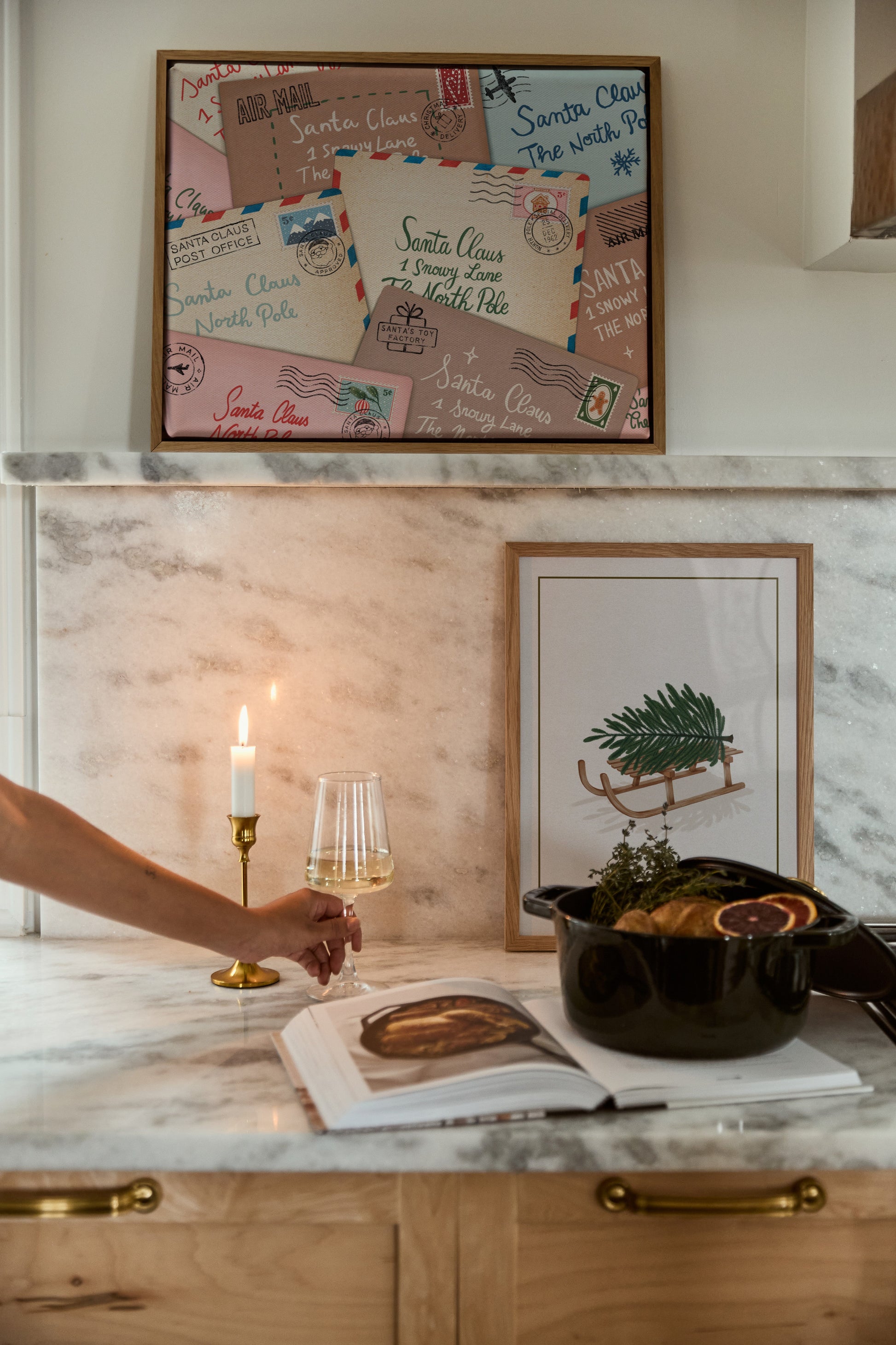 This artwork balances playfulness with a timeless holiday theme, creating a festive atmosphere that feels both nostalgic and fresh. The arrangement of the envelopes, scattered across the page as if ready for their journey to the North Pole, brings an interactive quality to the piece, drawing you into the festive spirit. Every element, from the textured paper to the handwritten script, adds an extra layer of charm to this delightful print.